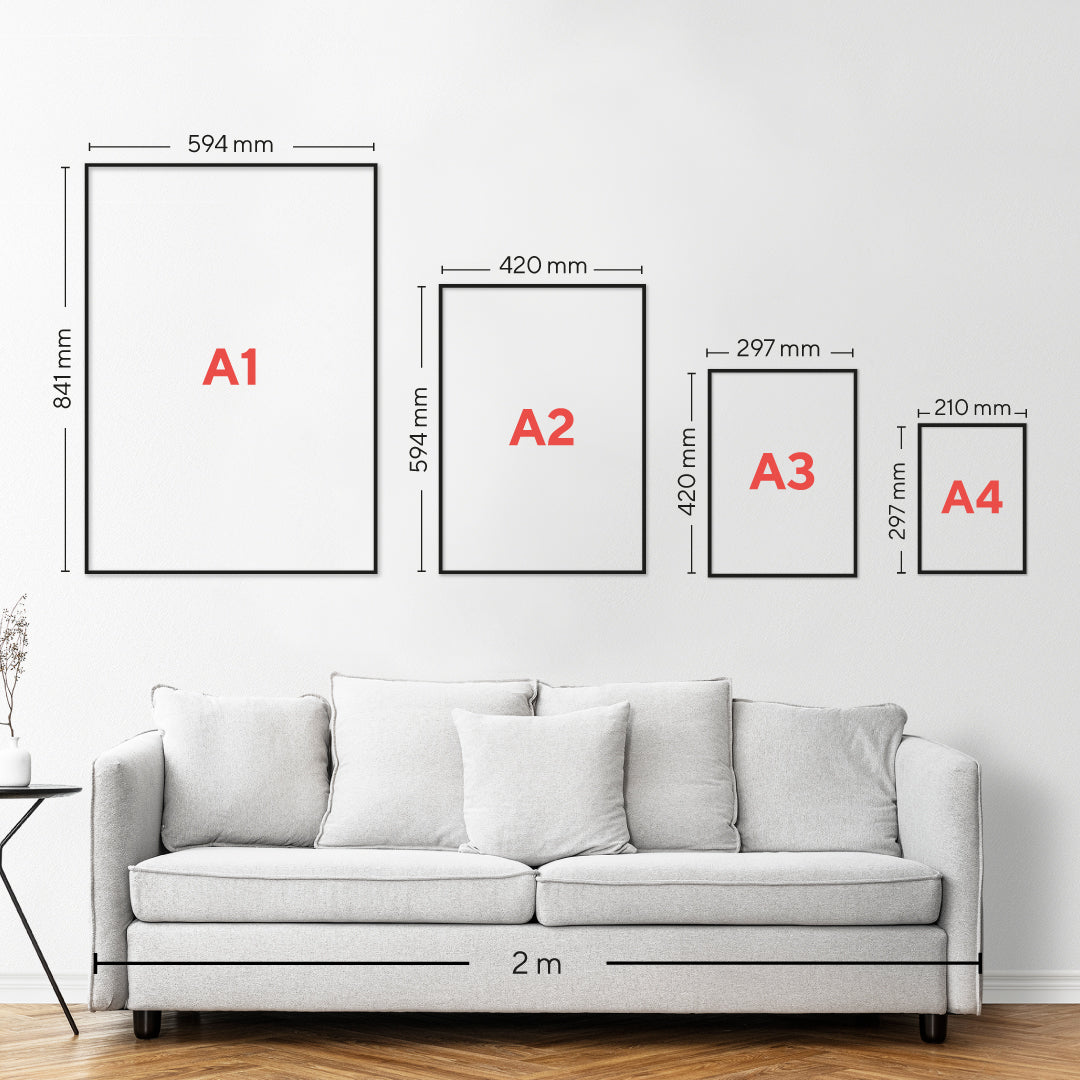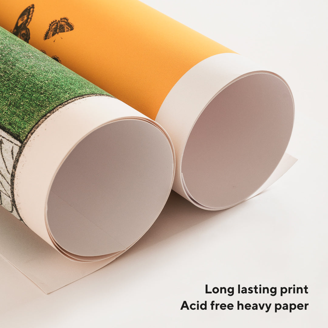 Our posters are printed on thick (230gsm) acid-free matte art paper, using a long-lasting UV-resistant ink. We also offer the option of printing on textured canvas (300gsm), more flexible and resistant. Our frames are made of either light and resistant aluminium, or solid wood. More details in our FAQ